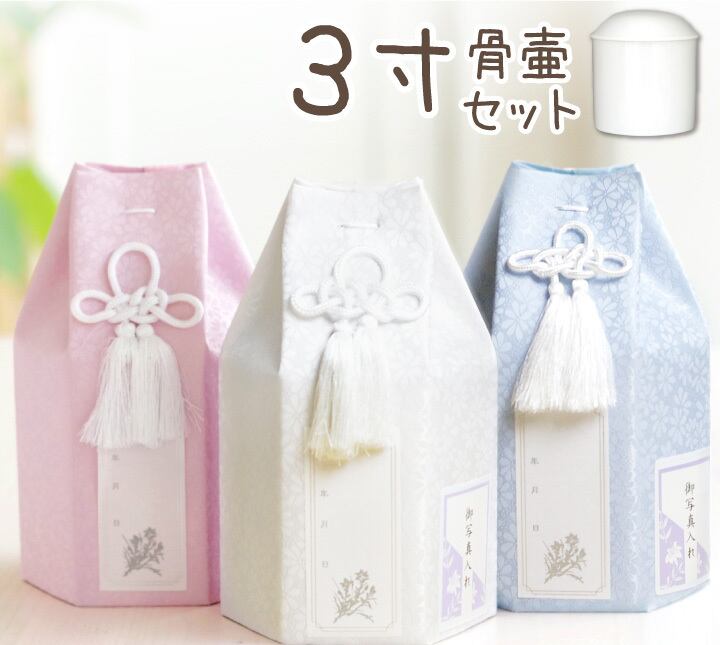 骨壷と骨袋のセット。ペット霊園でも使用されている上質な白並骨壷と骨壷カバーをセットにしてお届けします。
